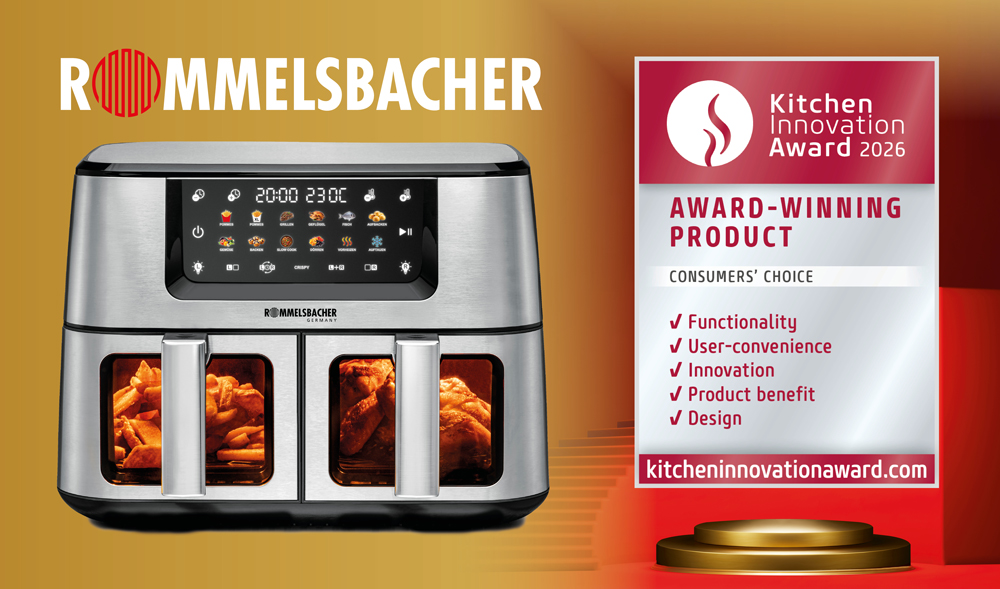Great pleasure at Rommelsbacher: the FRH 2650 XXL double hot air fryer has been awarded the prestigious Kitchen Innovation Award 2026. On 6 February 2026, the innovative appliance was officially honoured at the Ambiente trade fair in Frankfurt/Main – an award based on a unique two-stage selection process involving a comprehensive consumer survey. The award impressively demonstrates that successful products are created when people's needs are taken seriously and translated into user-centred solutions – which is exactly what Rommelsbacher has achieved with the FRH 2650 XXL.