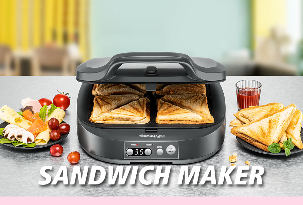 for 2 sandwichesWhether hearty, savoury, veggie or sweet – the multitude of recipes always offer a treat.The perfect kitchen aid for whipping a small warm meal in no time, for entertaining guests at short notice or for preparing a small snack in between. The unit heats up rapidly and is very easy to operate. Aluminium die-cast toast plates distribute the heat optimally and guarantee a delicious crunchy surface of the filled toast slices. The heat-insulated handle with locking and the anti-slide feet assure safe handling. The non-stick coating allows for easy cleaning. When everyone has had enough, the appliance can be stored in a space-saving way - upright in the cabinet.