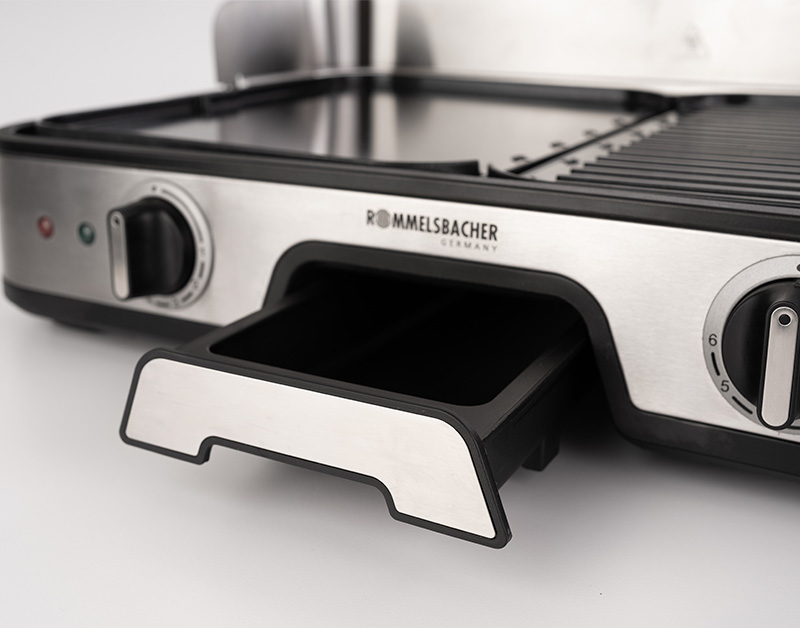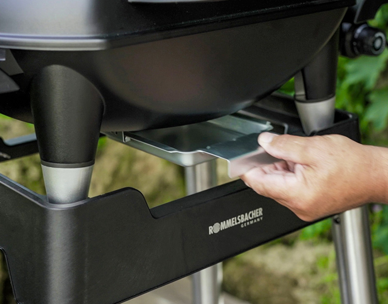 Integrierte, entnehmbare Edelstahl Fett-Auffangrinne und Aufstellfuß zur Schrägstellung für gesundes, fettarmes Grillen
