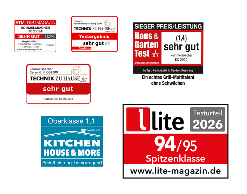 Verschiedene Testberichte bestätigen die Qualität unserer Elektrogrills. Die abgebildeten Siegel zeigen eine Auswahl an Auszeichnungen, die einzelne Modelle erhalten haben. Besonders geschätzt werden die gleichmäßigen Grillergebnisse, die hochwertige Verarbeitung und die einfache Handhabung unserer Elektro- und Tischgrills. Entdecken Sie alle Modelle und finden Sie den Grill, der am besten zu Ihnen passt.
